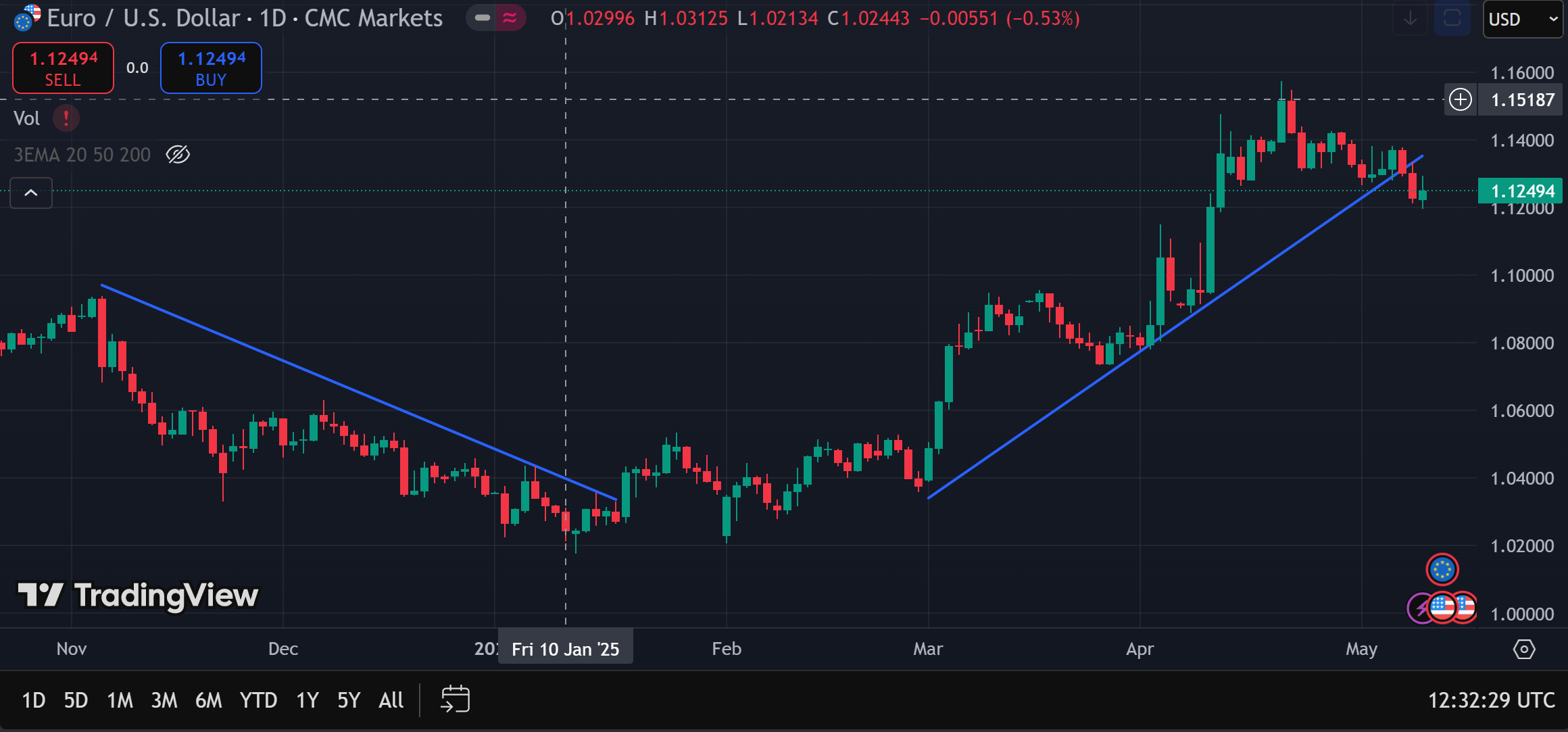 Between Nov 2024 to Jan 2025, we can see the currency pair is in a clear downtrend. A trend following trader would place a short trade to sell the pair, maintaining the trade until there are signs of a trend reversal.