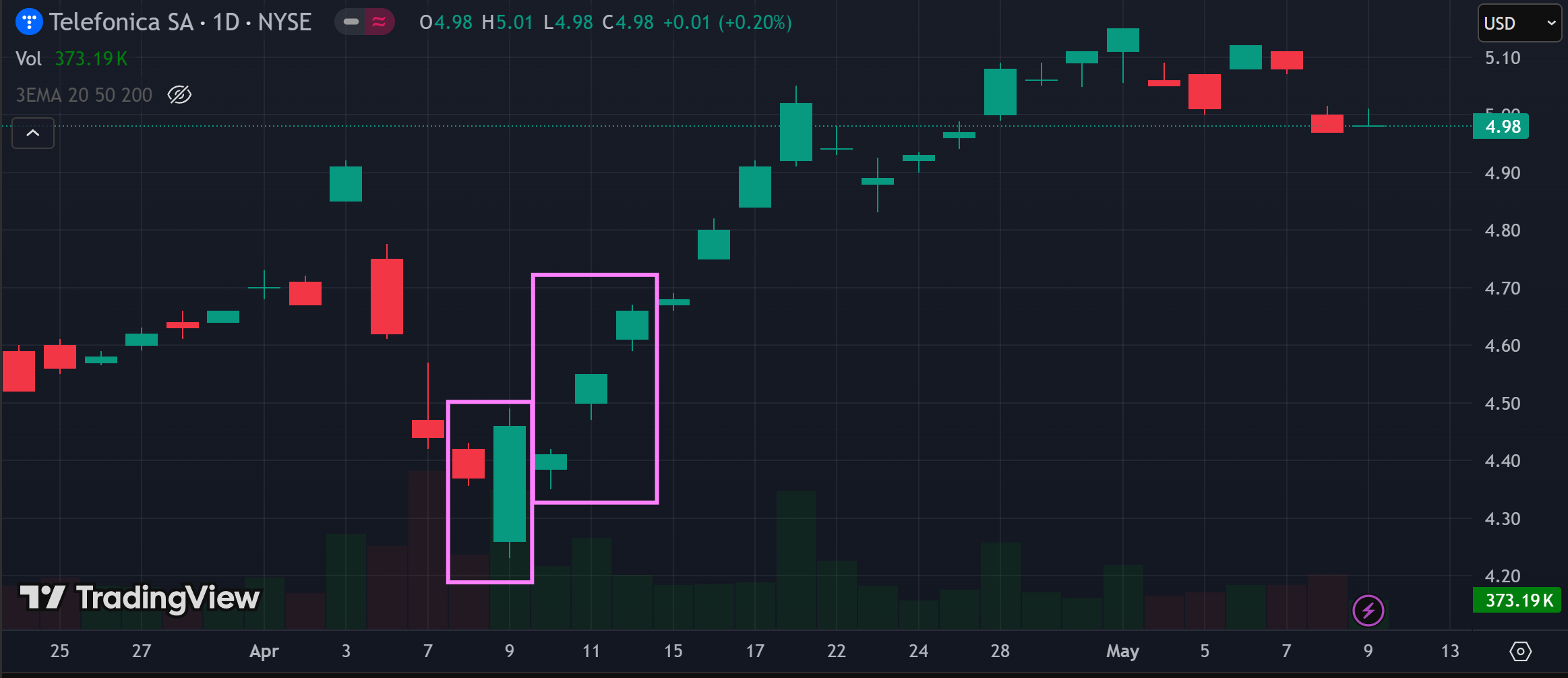 The chart above shows the price of Telefonica stock in Apr and May. Notice the clear uptrend which started from 9 Apr and lasted all the way until 1 May.