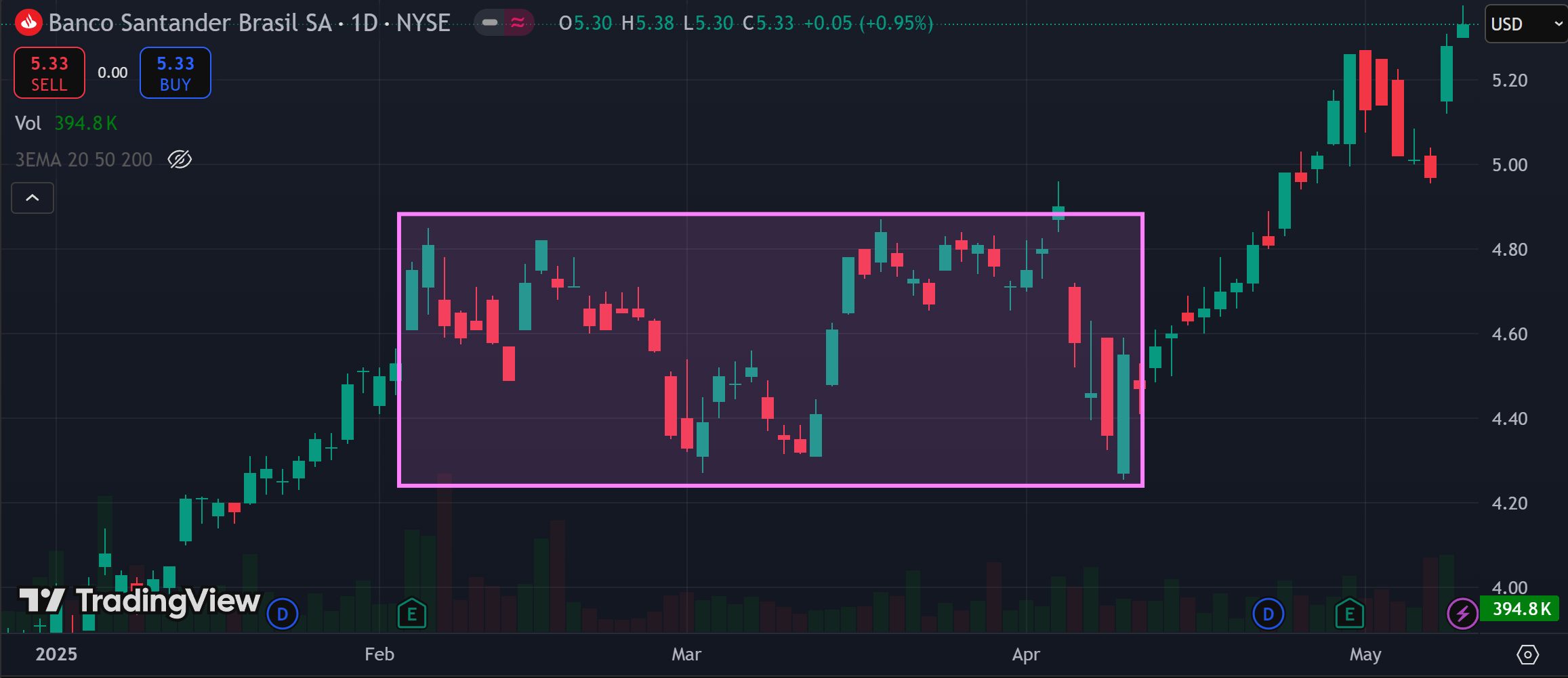 The screenshot above shows the price chart of Banco Santander (BSAC). The area highlighted by the pink box shows the stock exhibiting range-bound behaviour, which lasted from Feb to mid-Apr. This means there was a period of about 10 weeks in which a trader might have had success with range trading.