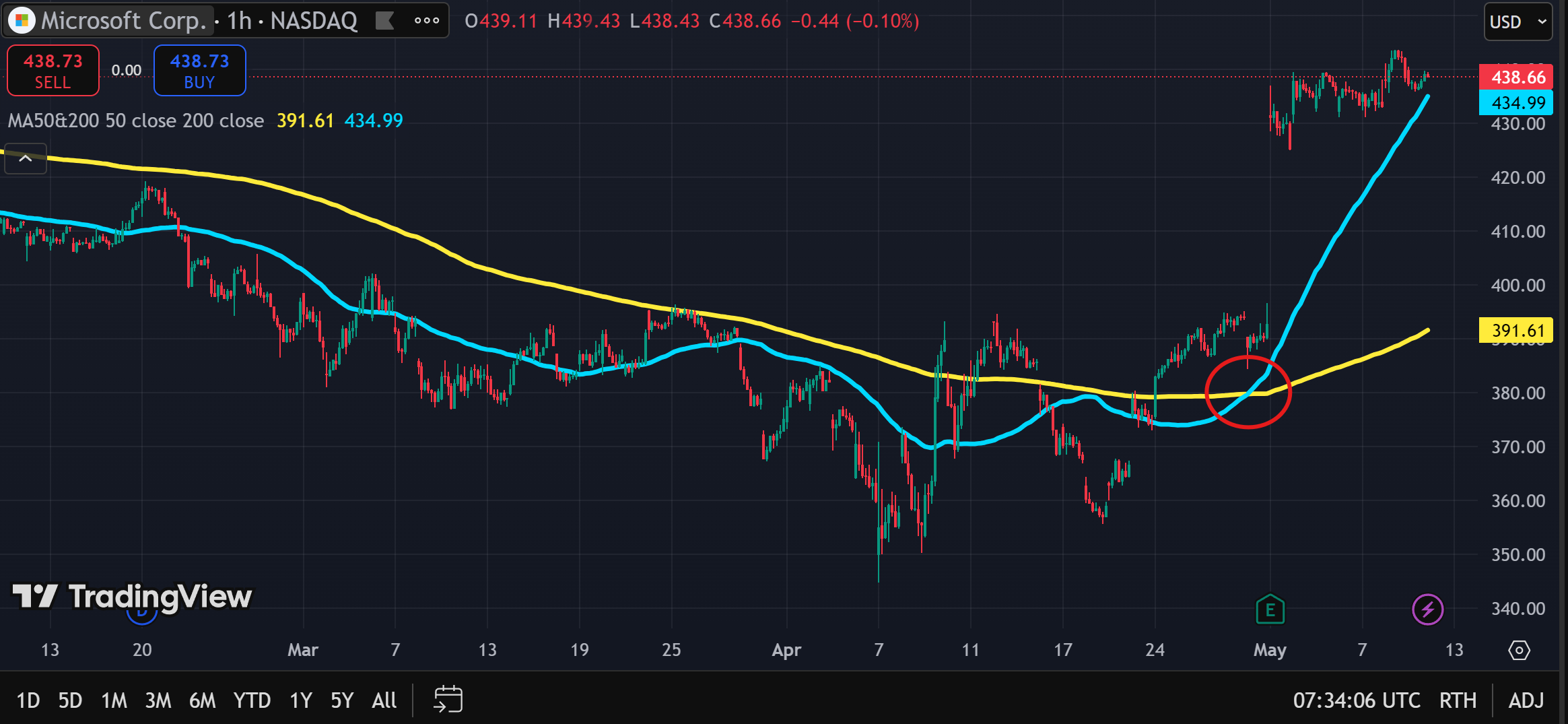 The screenshot above shows the price action of Microsoft (MSFT) from Mar to May 2025. After better-than-expected Q2 earnings, the price of the stock spiked upwards, as seen in the right side of the image.