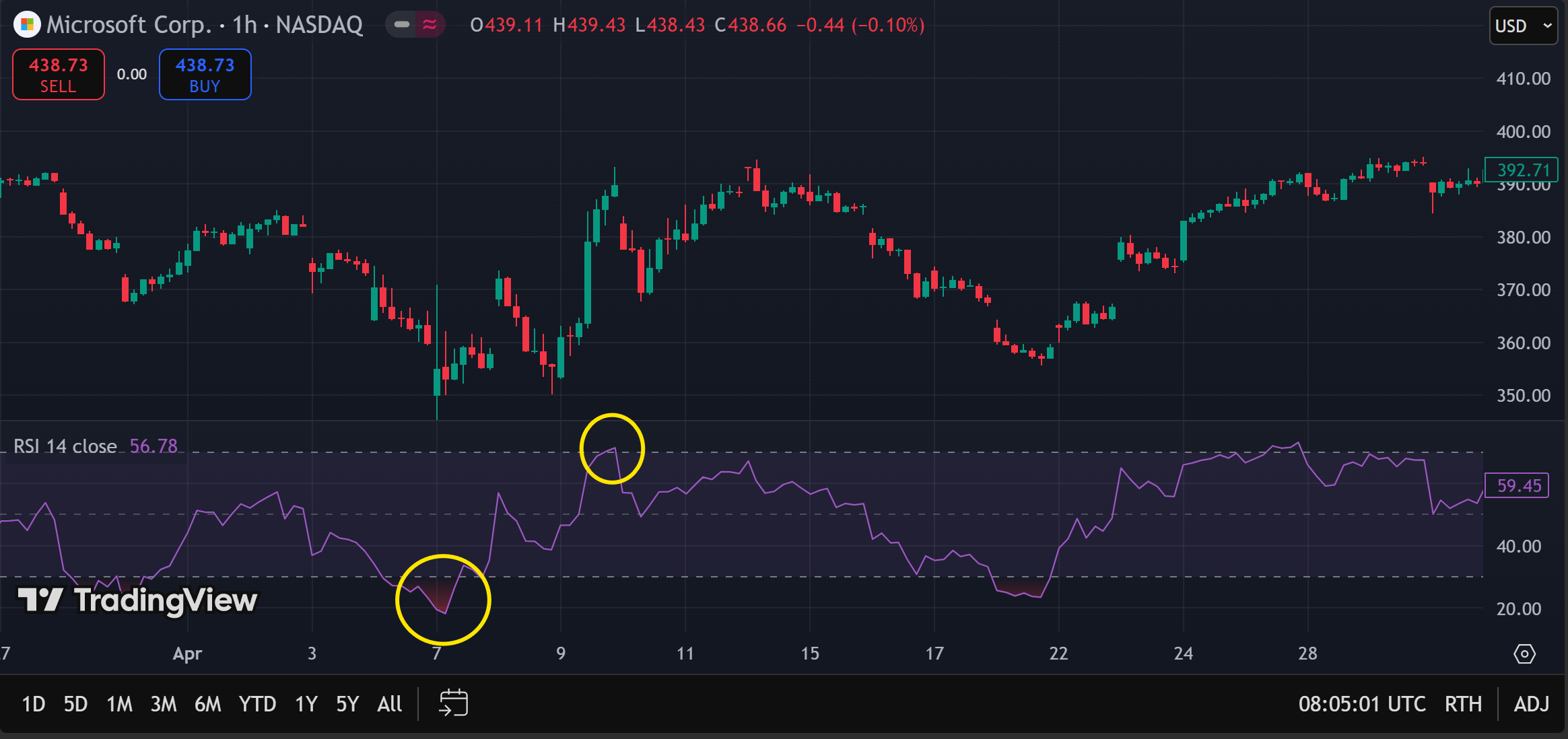 Notice the two areas of the RSI circled in yellow. In the first one, the RSI fell below the band, suggesting that MSFT was oversold. This could be considered an entry point, offering an opportunity to open a long position on the stock.