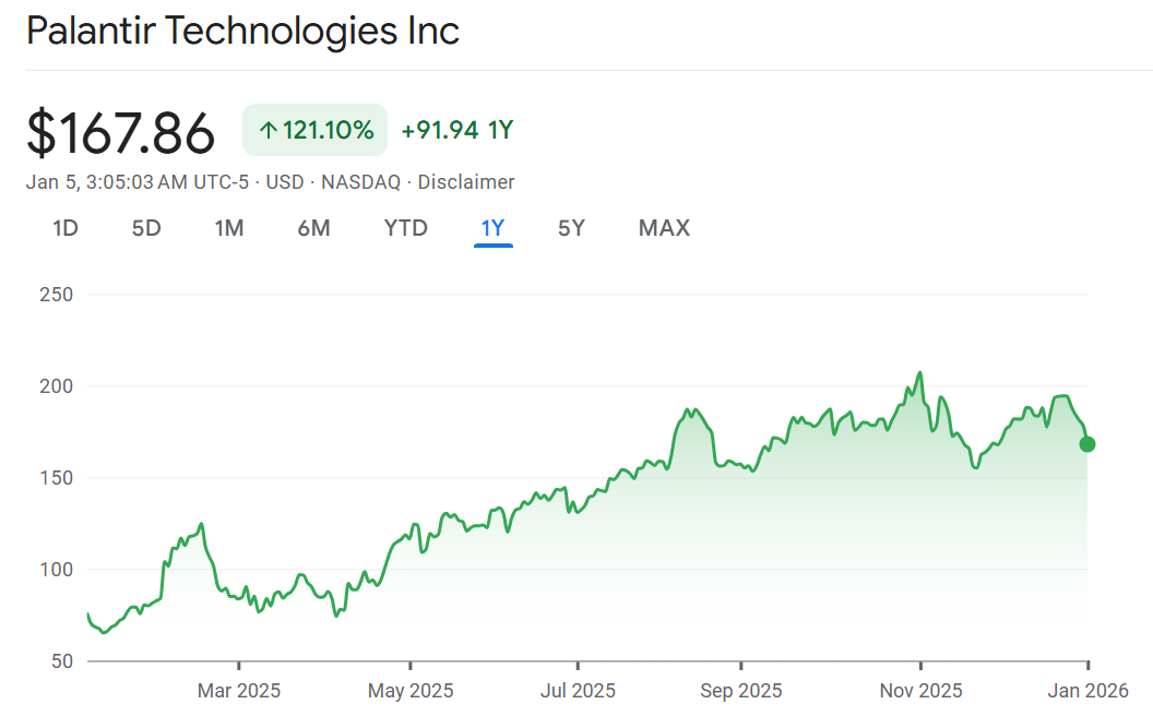 - “NASDAQ: PLTR Stock Chart – 12M.” TradingView, https://www.tradingview.com/symbols/NASDAQ-PLTR/?timeframe=12M. Accessed 5 January 2026.