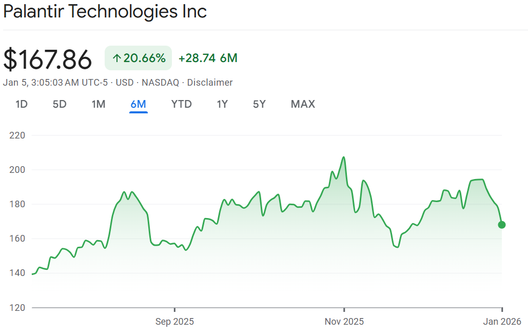 - “Palantir Stock $150 in 2025 History.” Yahoo Finance, https://finance.yahoo.com/news/palantir-stock-150-2025-history-091500261.html. Accessed 5 January 2026.