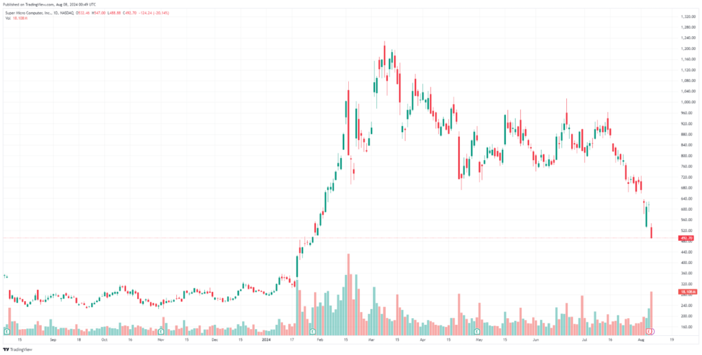 - Supermicro shares plummeted by 13% on Tuesday, 6 August 2024, following the release of their fiscal fourth-quarter earnings, which fell short of analysts’ predictions.