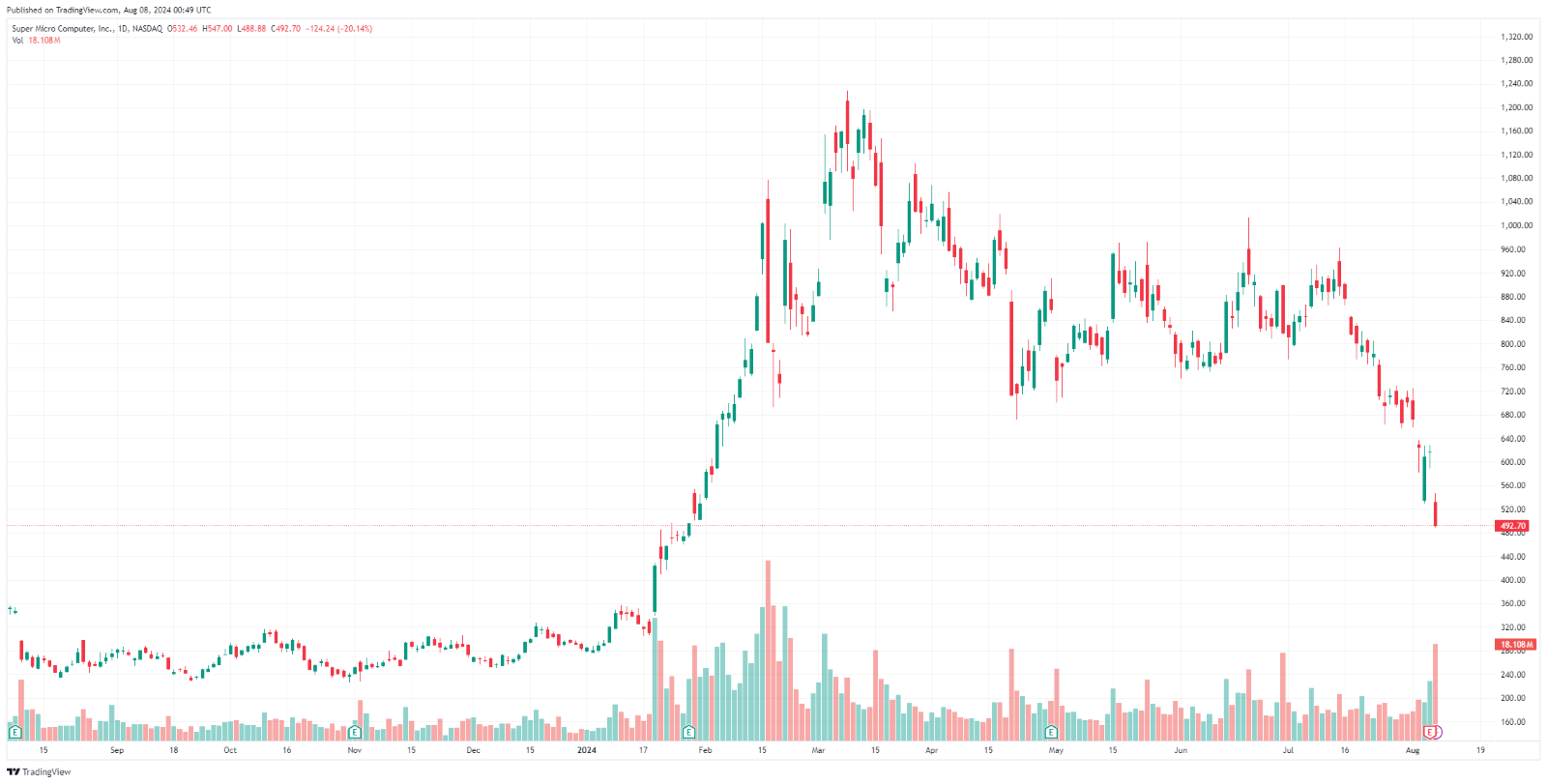 In July, SMCI continued to decline as concerns over the sustainability of the AI growth trend intensified, contributing to a broader market pullback in tech stocks [7].