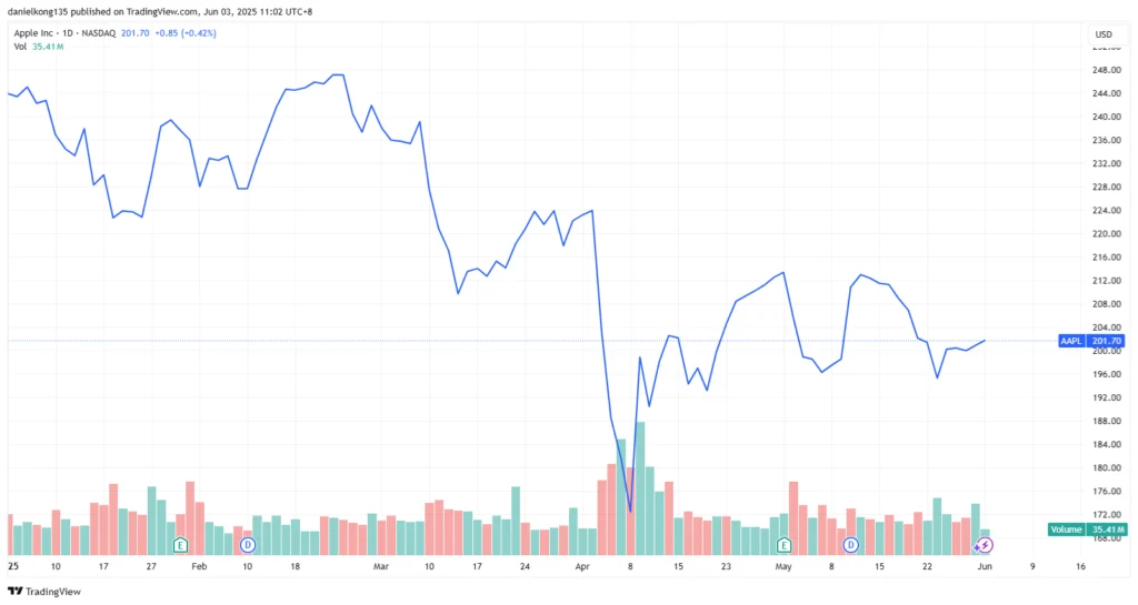 Chart 1: Apple price chart from Jan 2025 – May 2025. Source: https://www.tradingview.com/x/aiYYeSbw/