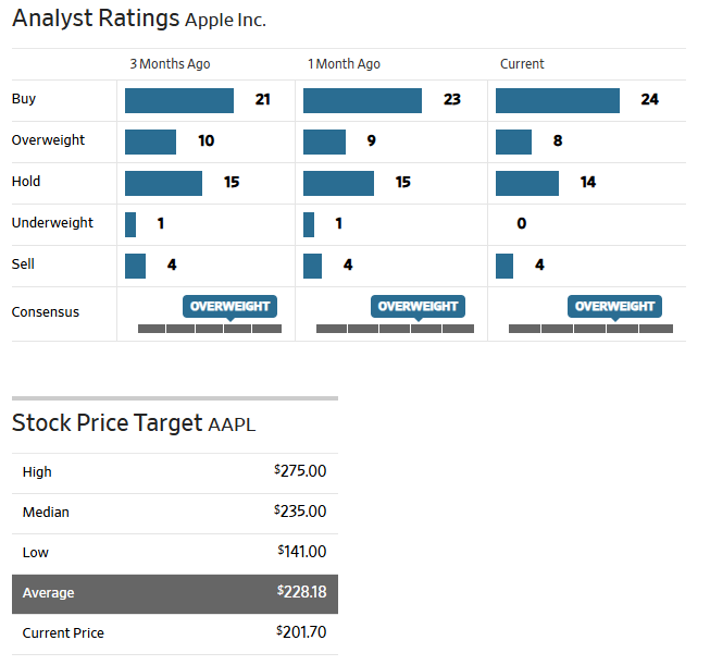 Image 1: Apple analyst rating and stock target price. Source: https://www.wsj.com/market-data/quotes/AAPL/research-ratings