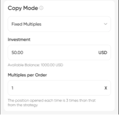 Fixed Multiples mean the volume of a trade mirrored in the Copier’s account is a multiple from the original order size from the Signal Provider. For example, if you choose a multiple of 3, each copied position will be 3 times the size of the original strategy. This Copy Mode is suitable if you have a higher risk tolerance, or if you have full confidence in the Signal Provider’s strategy.
