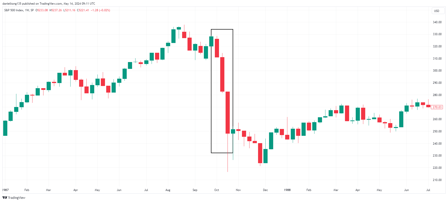 In the chart above, it depicts the S&P 500’s performance from January 1987 to July 1988, highlighting the dramatic drop during Black Monday in October 1987. The marked area shows a sharp decline, where the index fell over 20% in a single day, reflecting the market crash’s severity. Following the crash, the chart shows a period of volatility and gradual recovery over the subsequent months.