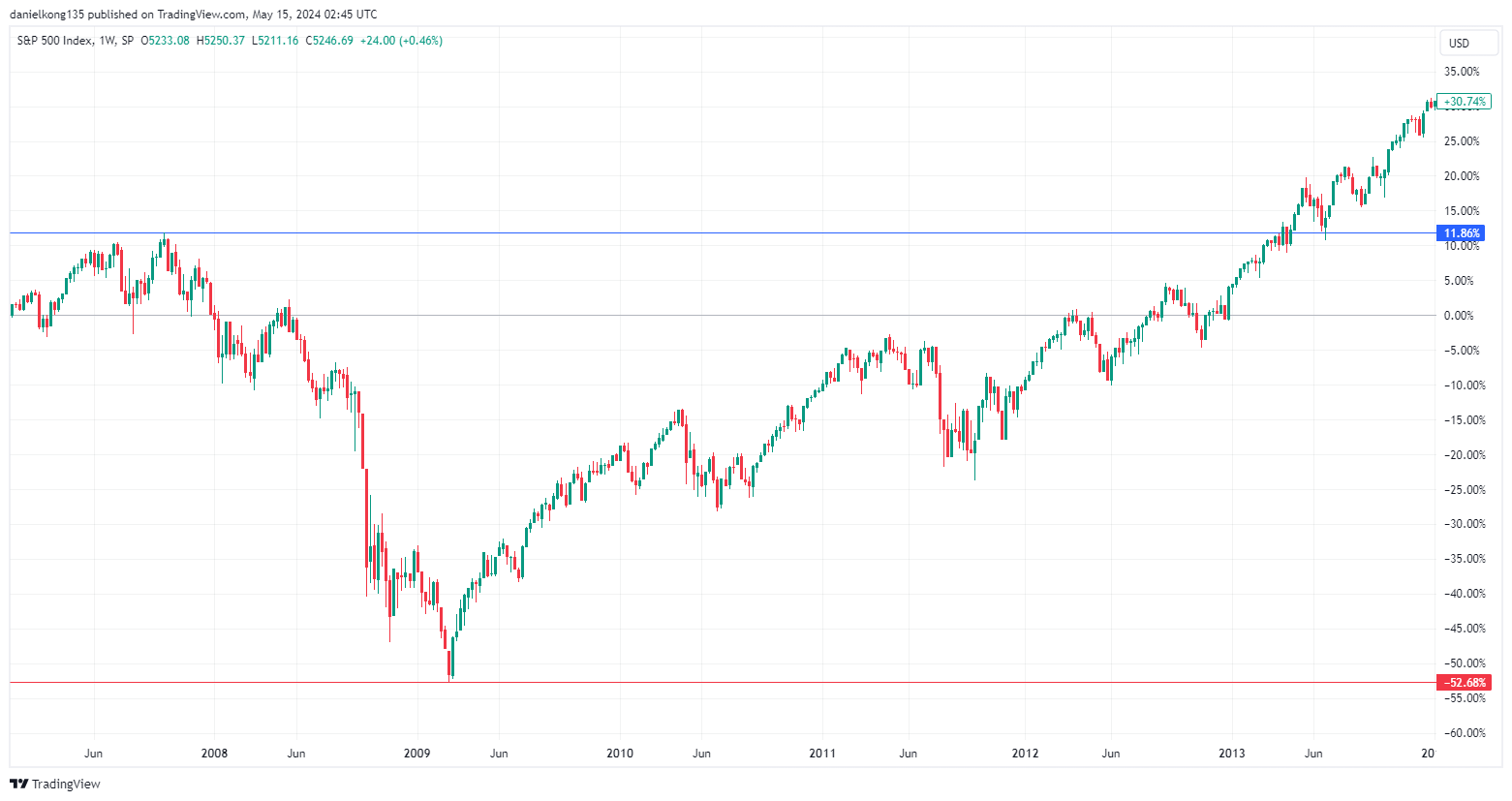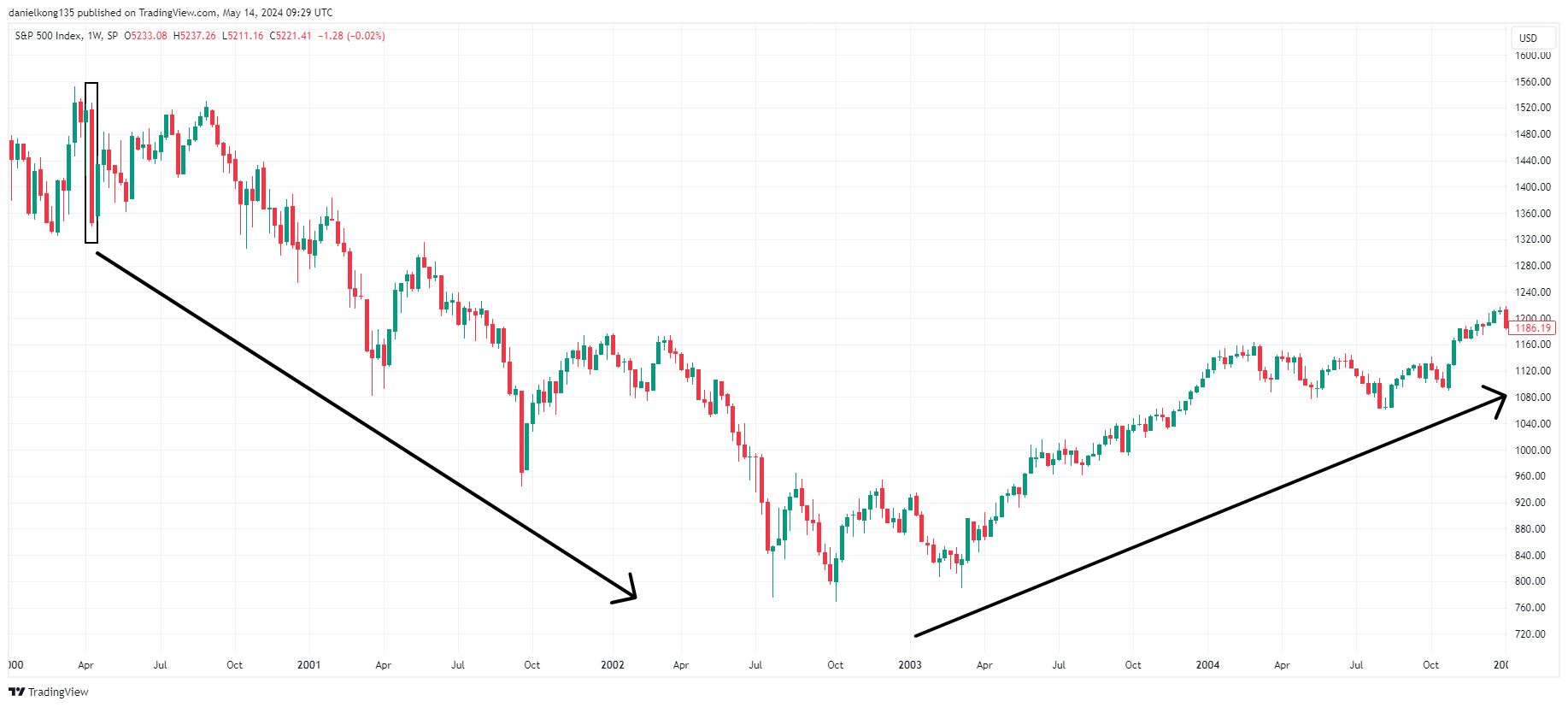 This chart illustrates the S&P 500’s performance from January 2000 to December 2004, highlighting the impact of the dot-com bubble crash. The marked area shows the index plummeting in April 2000 as the bubble burst. The index experienced a sharp decline from early 2000, continuing its downward trend until late 2002 as the bubble burst. Following this period, the market began a gradual recovery, marked by consistent gains over the subsequent years. By 2003 and 2004, the S&P 500 showed significant recovery, reflecting a robust resurgence in market confidence and stability.