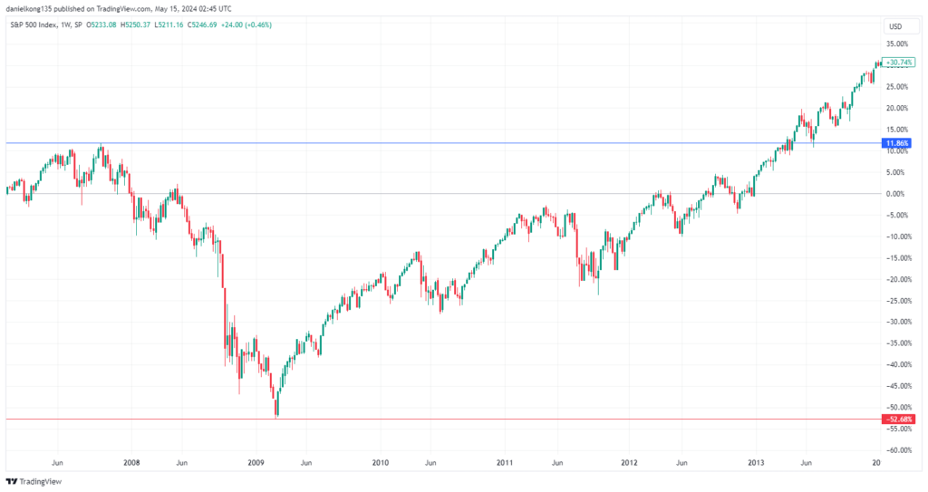 The chart above shows the S&P 500’s performance from January 2007 to December 2014, highlighting the period during the Great Recession and its aftermath. The index fell by 57% between 2007 and 2009 during this volatile period. As shown in the chart, it took approximately four years to recover from its lowest point in March 2009 before exceeding the highs of 2007 in April 2013.