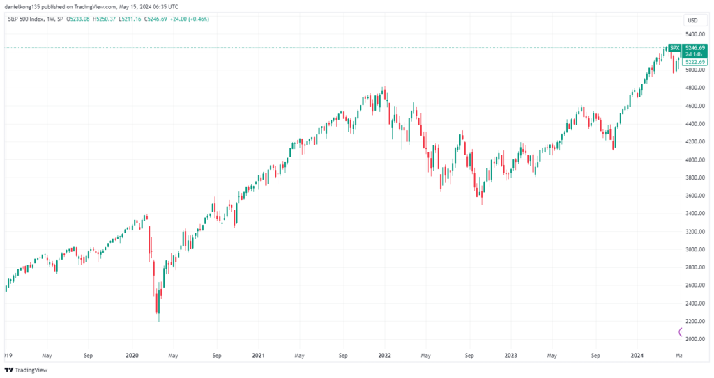 This chart illustrates the S&P 500’s performance from January 2019 to April 2024. In early 2020, the index experienced a sharp decline due to the COVID-19 pandemic, which caused global economic disruptions and a rapid sell-off in markets.