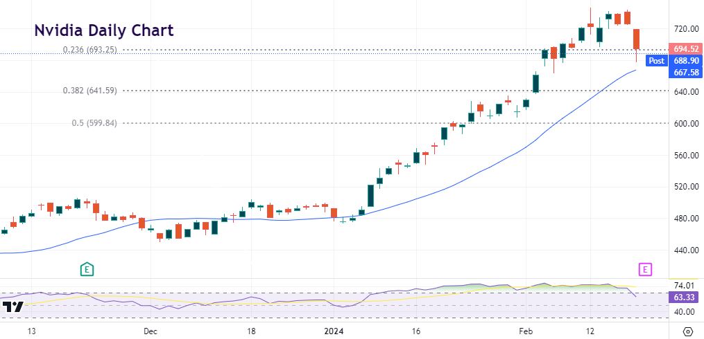 Tellingly, the stock market darling sold off quite aggressively yesterday ahead of its results. Nvidia dropped over 4%, its worst loss in more than four months. It had surged over 50% this year alone, after rising 237% in value last year. Consensus expects earnings of $4.56 a share and revenue to rise to $20.6bn, a startling 240% increase. Options markets are pricing in a double-digit price swing in either direction. That kind of move on a $1.8trn+ company will cause volatility in tech stocks and the indices. As we noted yesterday, the chip giant has a 4% and 5% weighting in the S&P 500 and Nasdaq 100 respectively. We’ve drawn some Fibonacci levels from the swing low at the end of October to the recent record intraday high at $746.11. The first retracement comes in at $662.61, with the next major one (38.2%) at $610.95. That would be a roughly 12% move from yesterday’s closing price.