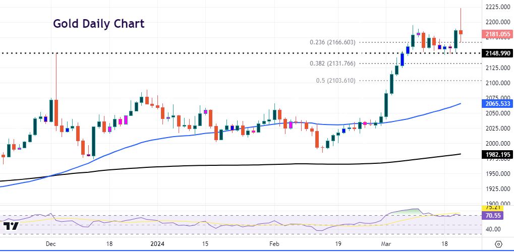 Prices tracked sideways for several days but held strong support at a prior spike high at $2148. We know that the longer prices trade in a narrow range, the bigger the breakout will be. That is normally in line with the long-term dominant trend. Prices broke higher after the FOMC and surged to another record high at $2222. But sellers have slammed gold lower with the metal eventually down 0.2% on the day. The candlestick is a bearish signal and warns of a blow-off top with conditions still overbought.