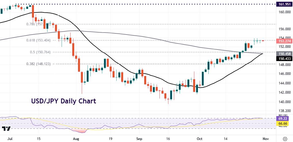 Prices are nearing overbought territory but the couple of inside days just looks like a bullish consolidation pattern. This week’s high is at 153.86, with a minor Fib retracement level of the July to September move above 157. The 61.8% level of that move sits at 153.40 with the midway point at 150.76.