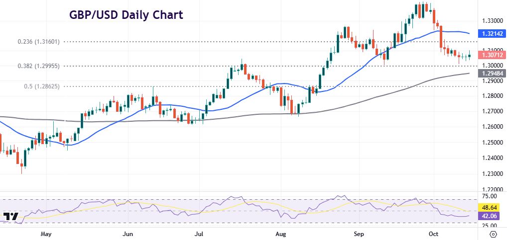 A major Fib retracement level (38.2%) of the April to September rally sits at 1.2995. The mid-September low is 1.3001, reinforcing this support zone. If a base isn’t forming here, then we could see 1.2862 relatively quickly with the 100-day SMA at 1.2948 near-term support.