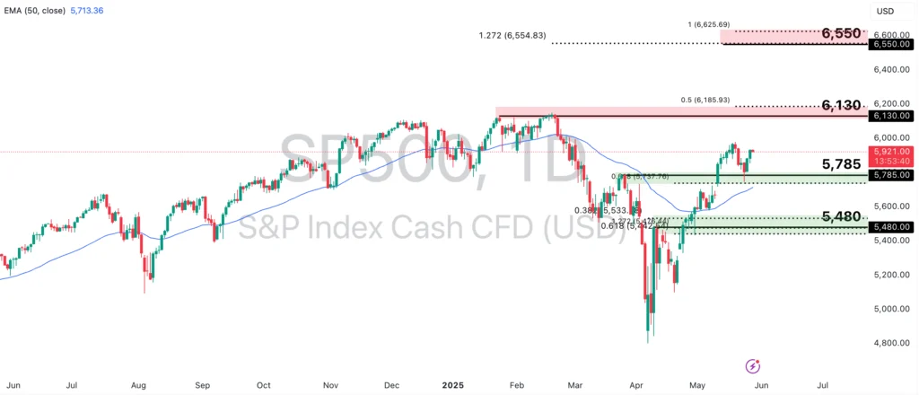 On the flip side, a deeper retracement could see the price retest the 5,785-point key support level, in line with the 50-EMA and 61.8% Fibonacci Extension level, or fall further to the 5,480-point support zone, which coincides with a broader Fibonacci confluence area.