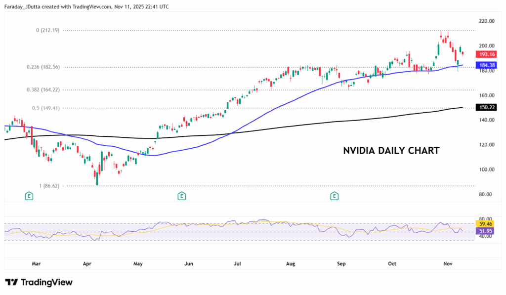 We covered the tech-laden Nasdaq yesterday, and where Nvidia goes, so do the broader indices. This is because a $5 trillion market cap gives you a roughly 7.6% and 13.9% weighting in the S&P 500 and Nasdaq respectively. As concerns ramp up about AI valuations and AI capex, last week saw the world’s biggest stock by market cap suffer its worst week since mid-April, falling over 7%. Prices touched the 50-day SMA on Friday but bounced back strongly and on Monday. That is well watched momentmu indicator is currently at $184.80. That level sits just above a minor Fib level (23.6%) of the April rally to record high at the end of last month at $182.56, reinforcing it as a strong support zone. The record top is at $212.19 with their earnings report due next Wednesday after the US market close. Guidance is currently pointing to $54bn in revenue and strong data growth given by Blackwell architecture. Needless to say, this is a big risk event for NVDA, AI and the wider market.