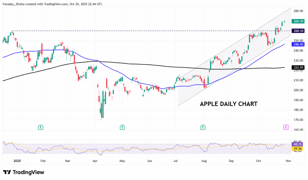 Apple heads into its earnings release having just hit a record high. But the stock had struggled this year before its positive iPhone 17 launch saw buyers return. The stock is now up just over 9% in 2025 so far, so underperforming the broader S&P 500. Consensus expects diluted EPS at $1.76, on revenues of $101.7bln. Apple has obvious strong product and services growth. But investors will be wary of tariff exposure and competition in China and in AI. Options imply a relatively modest move of +/-3.4% in the 24 hours following the upcoming report, though the stock has ended earnings day in the red following the last four consecutive reports. Prices are in a solid bull channel of higher highs and higher lows since early Summer. The December 2024 is a major swing high and previous resistance now support at $260.10.