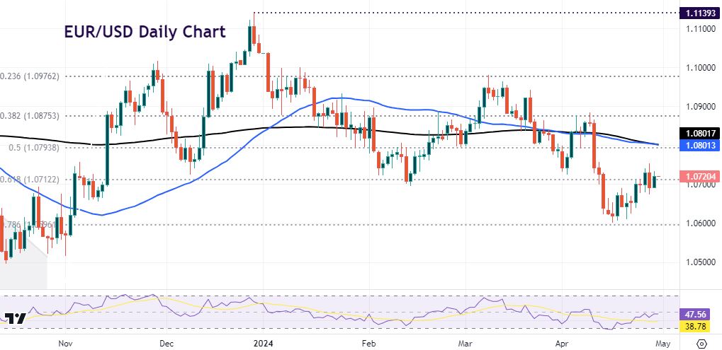 EUR found a bid but remains below last week’s high at 1.0752. German headline inflation remained stable in April hinting that the disinflation trend has stalled, and prices remain sticky. Core inflation fell again and should keep a June rate cut in play. The region’s price data is released today.