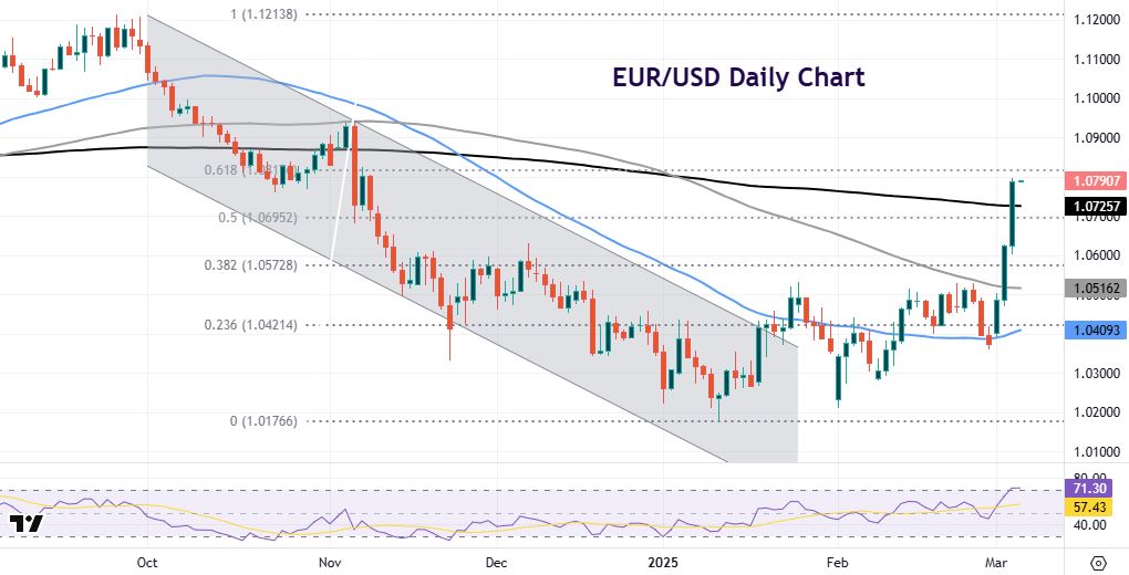 Of course, EUR has soared this week on the huge German and European fiscal plan around defence spending and infrastructure. A mineral deal and possible cease fire in Ukraine is back on the cards too. The world’s most popular currency pair has broken the midpoint of the September to January decline at 1.0572. The 200-day SMA has also been pierced at 1.0726. Next resistance is a major Fib level (61.8%) of that autumn drop at 1.0817. Prices are nearing overbought levels, so to the narrowing of rate differentials between EZ/US government bonds.