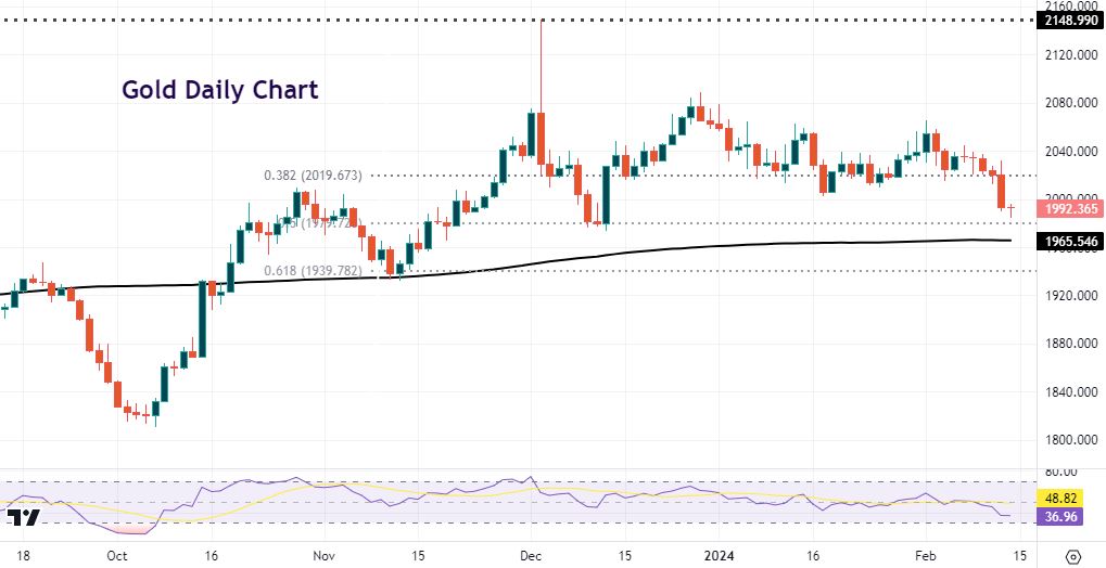 The precious metal has held above the $2,000 level since mid-December, supported by safe-haven demand amid geopolitical tensions. Expectations that the Fed will start to ease monetary policy this year have also reversed sharply. The outlook for gold will be largely dependent on Fed policy and if the pace of easing for this year is further dialled back. The 50% retrace level of the October-December rally is $1979. The 200-day SMA sits below at $1965.