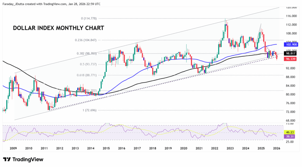 We don’t often put out a monthly chart but in the dollar’s case this time it is worth doing. We often highlight that after prices track sideways for a prolonged period, we get a big range breakout and expansion, typically in line with the longer-term trend. So, after months of relative FX calm, where the greenback tracked in a range around the 200-month SMA, dollar pairs went wild as Fed subpoenas and the Greenland drama sparked fresh doubts about US assets and the buck itself. Talk of possible US–Japan coordination to support the yen has been touted though reined in by Treasury Secretary Bessent. We also got Trump comments about the dollar slide, which he waved it off, saying the dollar was “doing great”. Markets ultimately heard that loud and clear: no defence of the dollar is a green light for more downside. The midpoint of the 2011 low to 2022 high sits at 93.73. But if it is a false breakout then prices need to get back above Monday’s gap at 97.43 and then to 100 with resistance just above.
