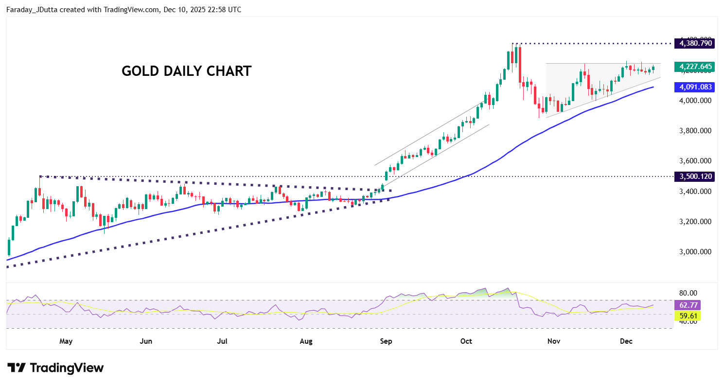 New Year 2026 year-end forecasts from investment banks are coming in with the latest being from Goldman Sachs. They predict upside to their end-2026 target of $4,900. More broadly, analyst expectations for the new year have shifted decisively higher, with most major institutions now forecasting gold between $4,000 and $5,300 per ounce, and several modelling scenarios materially above that range. Upside is expected to be driven by Fed rate cuts, strong ETF demand and continued central bank buying. Stronger debasement-driven scenarios suggest prices towards $6,000. The flip side to this could be a stronger dollar on less Fed policy easing and fading geopolitical tensions. In the near-term prices have been consolidating and tracking sideways above the 50-day SMA at $4,091. A bullish ascending triangle pattern could be developing. The record top is $4,381.