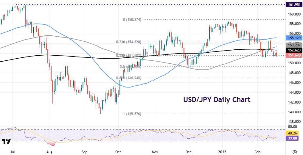 USDJPY has been consolidating and sits just above support at 151.50 (38.2% Fib retracement of September low to January high). Resistance is the 200-day SMA at 152.62 and 153.29, the 100 SMA.