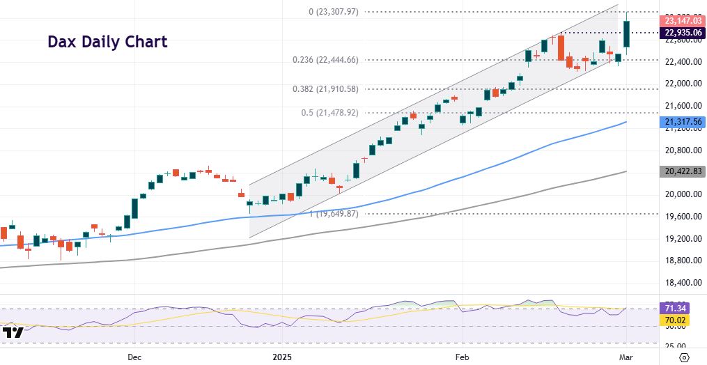 Improving economic activity, supportive monetary and fiscal policy, and potential peace in Ukraine are bolstering growth and stock performance in Europe. However, much uncertainty lies ahead, with tariffs incoming and geopolitics highly volatile. Bulls are aiming for new round numbers like 23,600. Bears would need to push the index back down through 22,444 and 22,226.