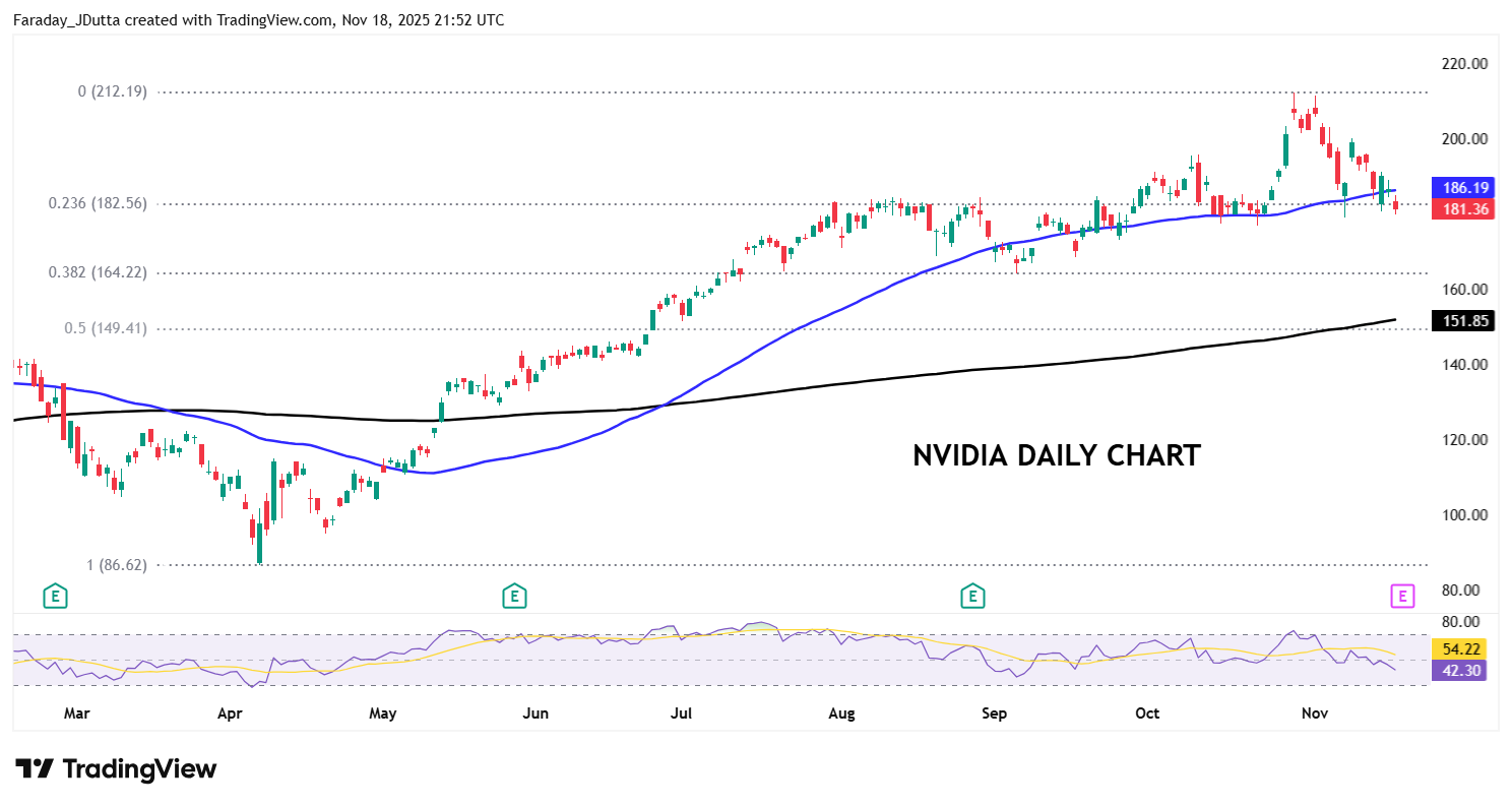 NVDA is the bellwether and gauge for the stock market (AI) rally. Markets predict NVDA could move 6.5% up or down in the trading session on Thursday, after its earnings release. The stock is up 34% this year. Wall Street analysts expect EPS of $1.23 per share, revenues of $54.7 billion for the quarter and growth rates of 50%++ revenue plus large EPS gains. Investors will be watching any “beat and raise” guidance, especially around next-quarter revenue and shipments of new chips (Blackwell, GB300), and strong demand in the data-centre business, which is the largest driver of growth and margins. Demand from the outside the big four hyperscalers will be a focus. Supply bottlenecks, margins and China exposure will also be analysed, as any signs of risk will matter for investor sentiment. The record high sits at $212.19, the 50-day SMA at $186.24 and a minor Fib of the April to November rally at $182.56. The next retracement (38.2%) is at $164.22.