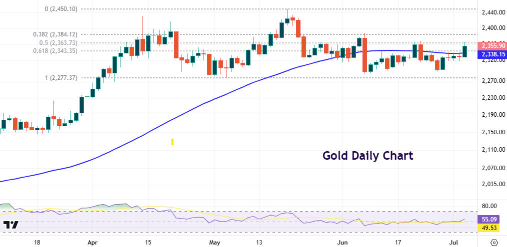 The World Gold Council in its half-yearly report expects bullion to remain range-bound over the second half of 2024. It says falling interest rates are likely to continue supporting prices as higher investment flows towards gold as an inflation hedge. There might also be hedging versus ongoing geopolitical tensions. However, the council did warn of a drop in central bank demand as a downside risk. The next upside level is the 50% mark of the May low/high move at $2363. Strong support at $2277.