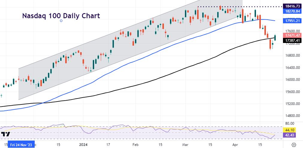 Other factors include geopolitical tensions in the Middle East, and earnings, both Q1 and expectations for the rest of the year, especially in tech where expectations have risen due to AI developments. Contributing to April performance is investor positioning, which had become elevated by the end of Q1. We get Meta, Alphabet and Microsoft results over the next couple of days. Tough quarter-on-quarter comparisons may be a high bar to major upside. For the Nasdaq, the 50-day SMA sits above at 17,950 with the recent low at 16,973. The 200-day SMA is at 17,387.
