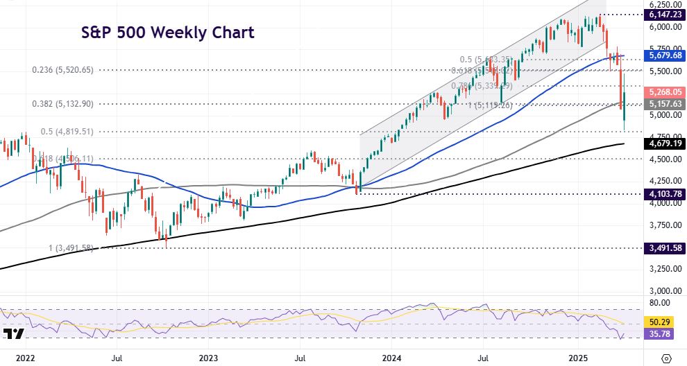 Similar to most rebounds it was cyclical large caps which did the outperformance. Tech stocks and consumer discretionary at the top, with Tesla, Apple and Nvidia surging around 20% each. On the S&P 500 chart, the 50% point of the late 2022 to February 2025 top is at 4,819. The 200-week SMA is below at 4,679. Initial resistance is 5,339 with initial support at 5,132.