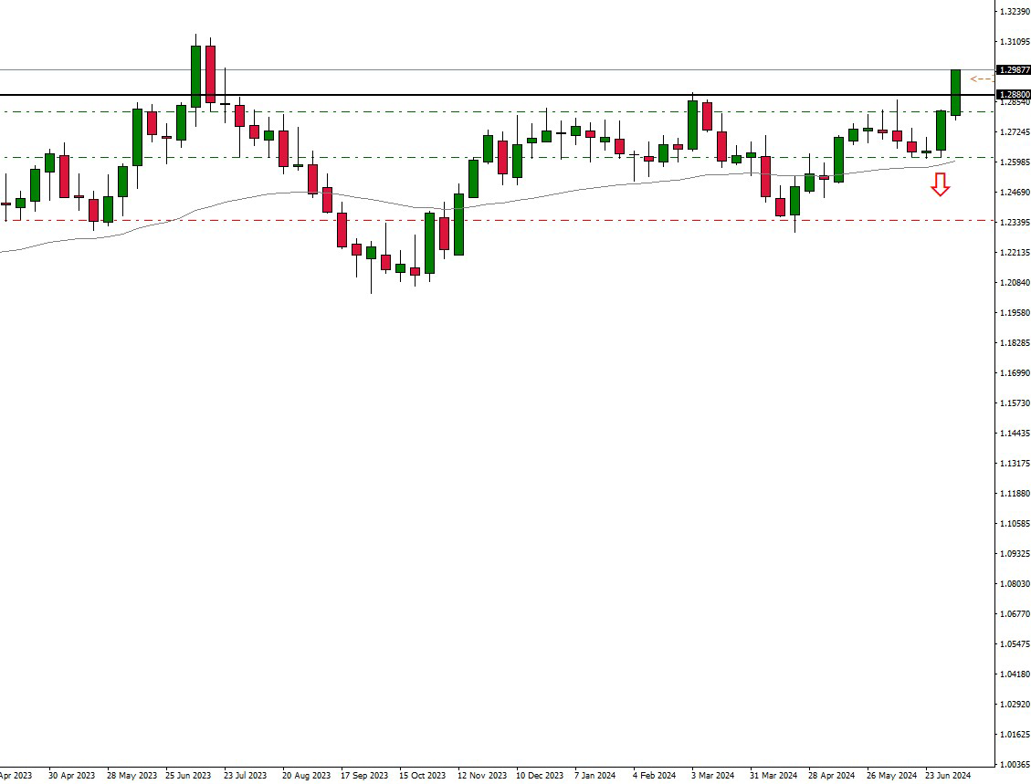 The weekly chart shows a break of the important resistance zone at 1.2880. This could now lead to further potential and move the market higher. The next resistance zone is at 1.3130. If consumer prices continue to fall, the market might retrace lower. This could then be used for fresh entries to the upside. The data will be published on Wednesday, 17 July at 08:00 CET.