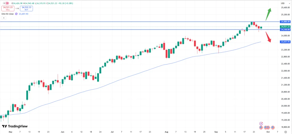 The current trend of the Nasdaq index shows, that the market is capped within a small trading range. Yet, the general positive trend is intact. While the support zone at 24.350 helps the market from falling further, the technical resistance at 24.800 needs to break in order to release fresh upside momentum. Negative data might initially cause the market to weaken slightly but should be seen positive as examined before. The data will be released on Friday, October 03 at 14:30 CET.