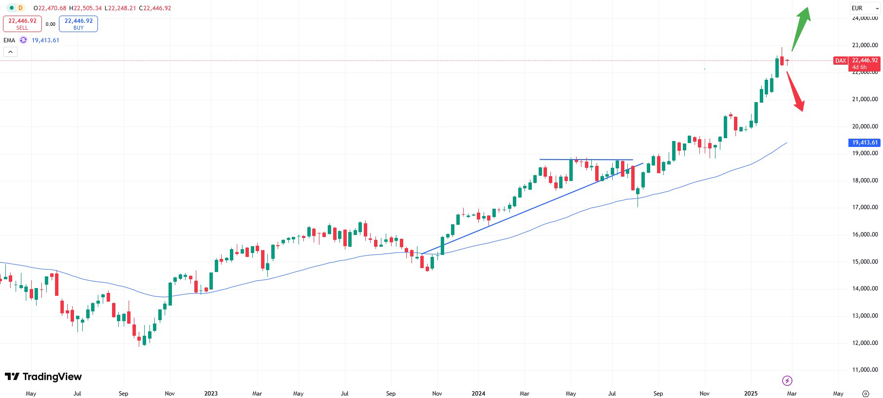 – DE preliminary consumer price index– after the decline in consumer prices last month, the momentum seems to turn positive again. This might be reason again to help the EUR to rise, similarly to the AUD as examined above. Yet, we now like to focus on the German equity index, the DAX. The market has been rising sharply in recent months, despite the negative sentiment in the German economy.