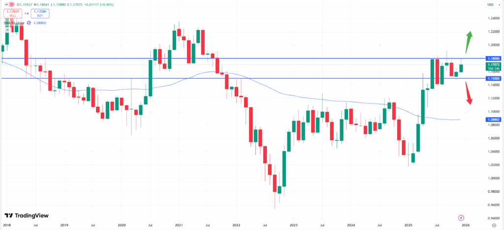Now, the market keeps trading between the technical resistance zone of 1.1800 and the support area at 1.1500. A breakout to the upside might be on the cards, especially when the Fed, the US Central Bank, will cut rates even further. The odds for this scenario remain positive: US inflation has gradually fallen recently, while employment data keeps falling as well. Reason enough for The Bank to cut rates in order to boost the US economy.