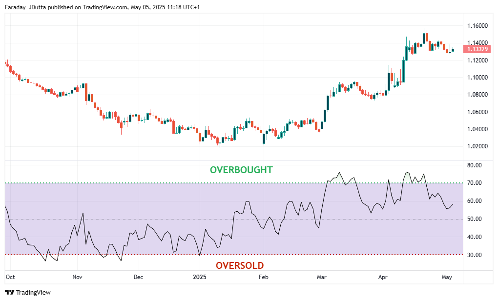 Chỉ số RSI được coi là “mua quá mức” khi trên 70 và “bán quá mức” khi dưới 30. Từ 30 đến 70 được coi là trung tính.