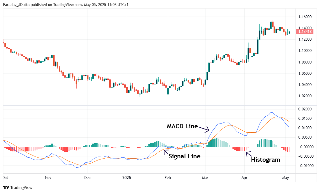 Sự khác biệt giữa đường MACD và đường tín hiệu được hiển thị dưới dạng biểu đồ, cung cấp hình ảnh trực quan về sự thay đổi động lượng.