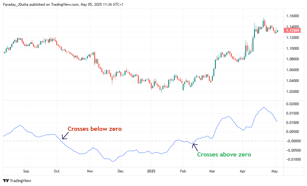 Khi đường MACD cắt lên trên đường zero, nó thường được coi là tín hiệu tăng giá. Ngược lại, cắt xuống dưới đường zero được coi là tín hiệu giảm giá. Một số nhà giao dịch cũng tìm kiếm tín hiệu Đường tín hiệu cắt xuống đường zero như một điểm xác nhận bổ sung.