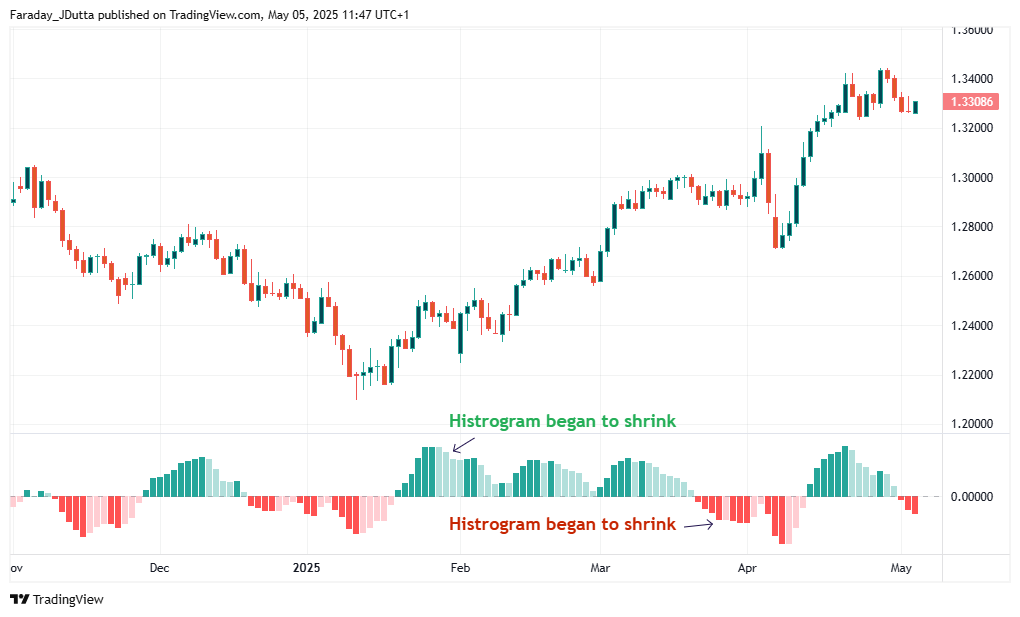 Khi biểu đồ bắt đầu co lại, điều này có thể báo hiệu rằng động lực, dù là tăng hay giảm, đang bắt đầu suy yếu.