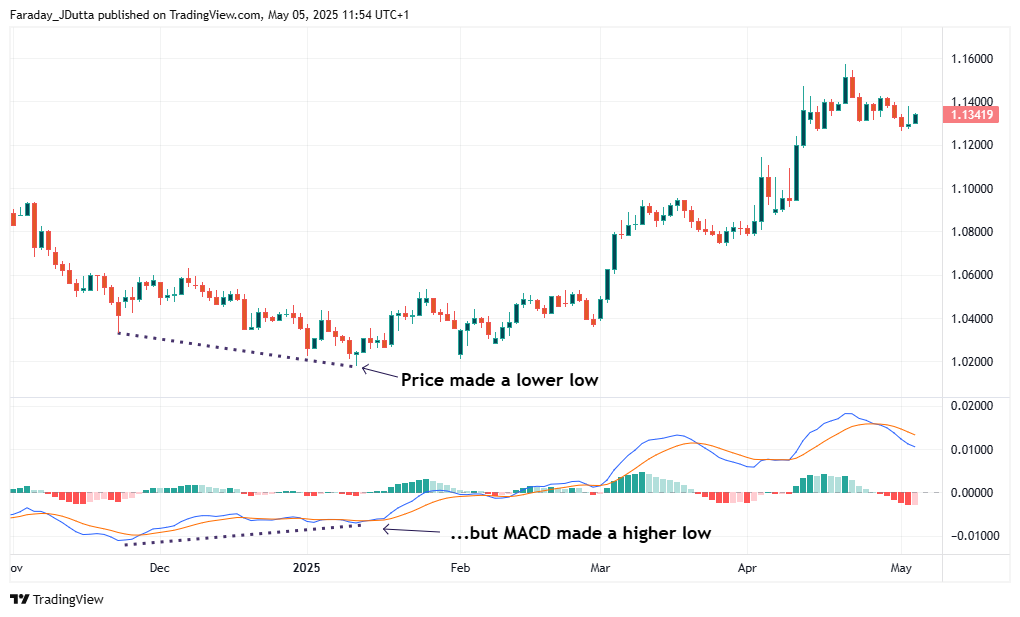Tuy nhiên, khi MACD không đi cùng hướng với giá, hiện tượng phân kỳ này có thể cho thấy thị trường đang chuẩn bị cho một sự thay đổi xu hướng.