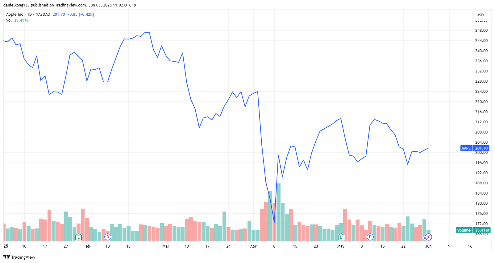 Cổ phiếu Apple đã trải qua biến động đáng kể trong bối cảnh lo ngại về thuế quan leo thang, ghi nhận mức giảm 19,8% từ đầu năm đến nay. Làn sóng bán tháo đã gia tăng vào tháng 4 sau thông báo về Ngày Giải phóng, với cổ phiếu giảm hơn 20%, trước khi phục hồi khoảng 16% kể từ đó.