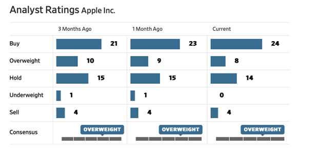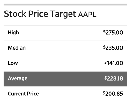 Tâm lý này được củng cố bởi xếp hạng của các nhà phân tích: 64% nhà phân tích theo dõi Apple khuyến nghị “Mua”, 28% khuyến nghị nắm giữ và chỉ 8% đề xuất bán. Mục tiêu giá trung bình 12 tháng là 228,18 đô la Mỹ, phản ánh ước tính của các nhà phân tích và có thể thay đổi so với giá cổ phiếu hiện tại là 200,85 đô la Mỹ.