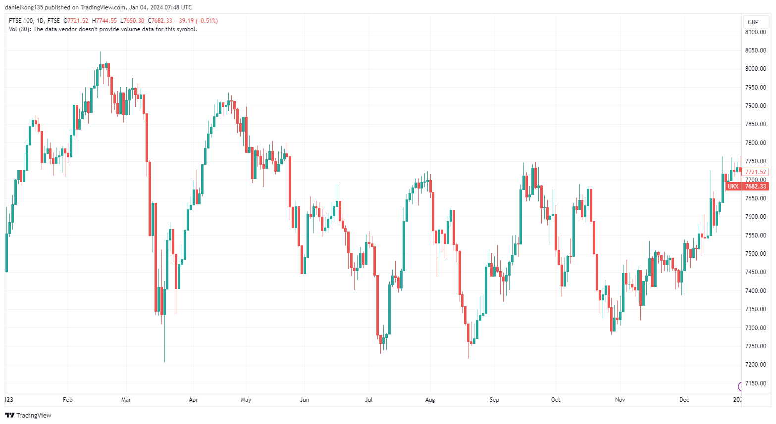 Chart 5: FTSE 100 price chart for 2023 (https://www.tradingview.com/x/iaxBQpo1/