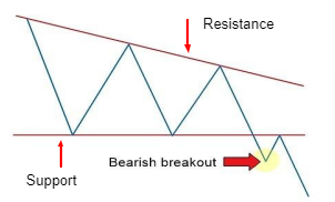 Sự phá vỡ xu hướng giảm xảy ra khi giá cổ phiếu giảm xuống dưới mức hỗ trợ quan trọng, báo hiệu sự bắt đầu của xu hướng giảm. Các nhà giao dịch thường coi đây là cơ hội để bán khống cổ phiếu hoặc thoát khỏi bất kỳ vị thế mua nào hiện có để tránh thua lỗ thêm.