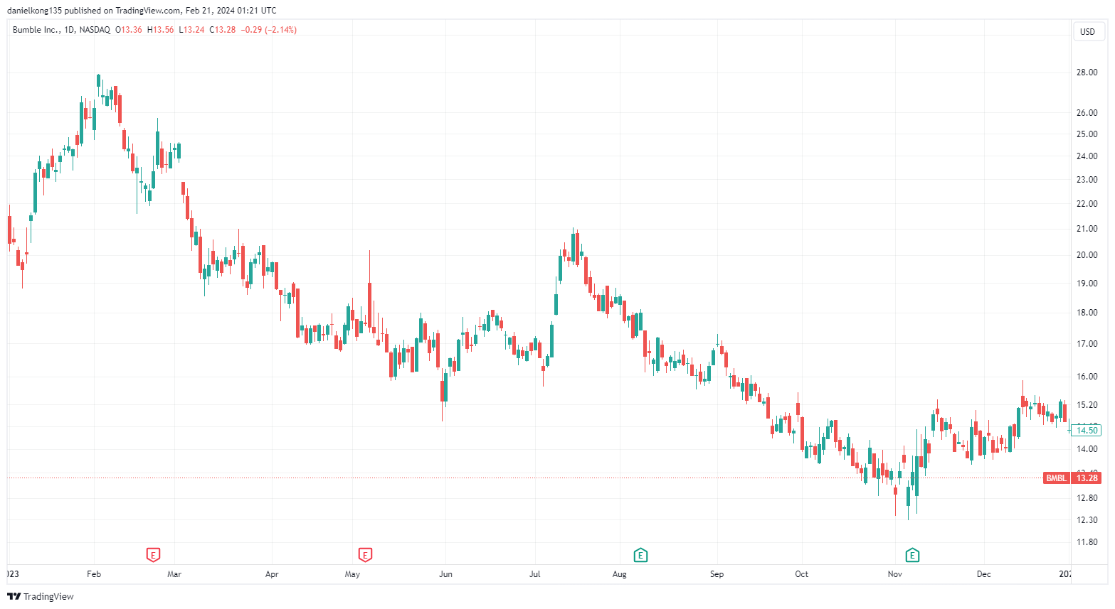 Giá đóng cửa cao nhất của Bumble là 27,09 đô la vào ngày 7 tháng 2 năm 2023 và liên tục giảm trong suốt năm 2023 cho đến năm 2024.