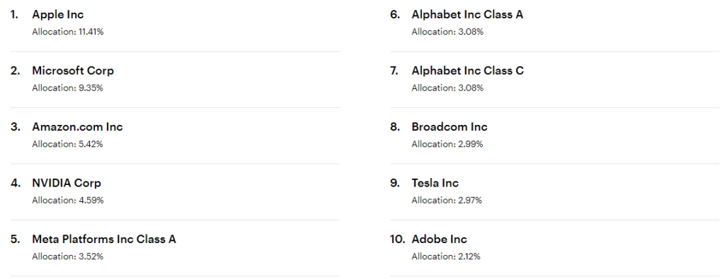 Ví dụ, 10 cổ phiếu nắm giữ nhiều nhất trong QQQ trông như thế này vào ngày 5 tháng 9 năm 2023: