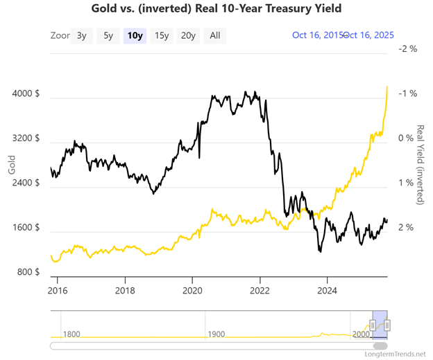 Biểu đồ 1: Giá vàng so với Lợi suất trái phiếu kỳ hạn 10 năm (đảo ngược) của Hoa Kỳ (tháng 10 năm 2015 đến tháng 10 năm 2025). Nguồn: https://www.longtermtrends.net/gold-vs-real-yields/
